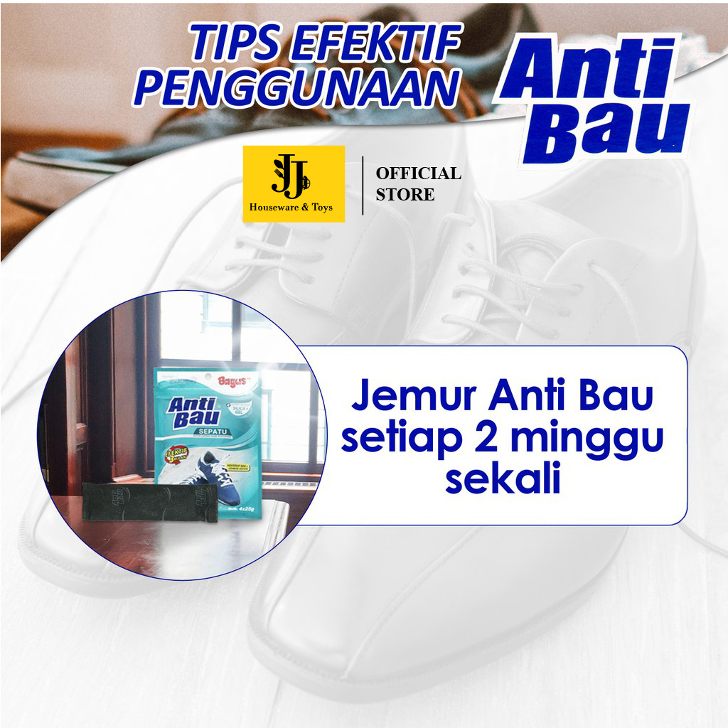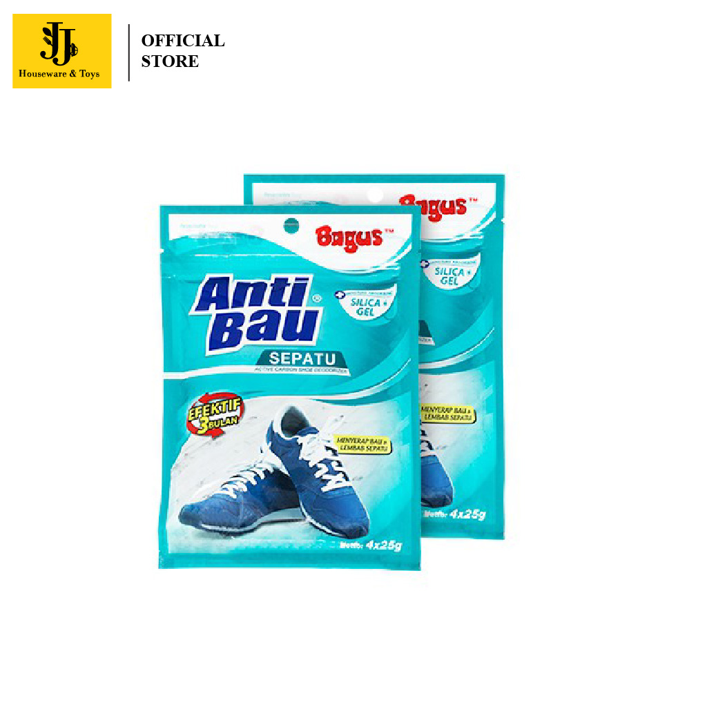 Bagus Anti Bau mengandung karbon aktif yang berfungsi menyerap dan menetralkan ion-ion penyebab bau tidak sedap di sekitar ruangan anda. Efektif untuk menghilangkan bau tak sedap di dalam sepatu kesayangan anda.