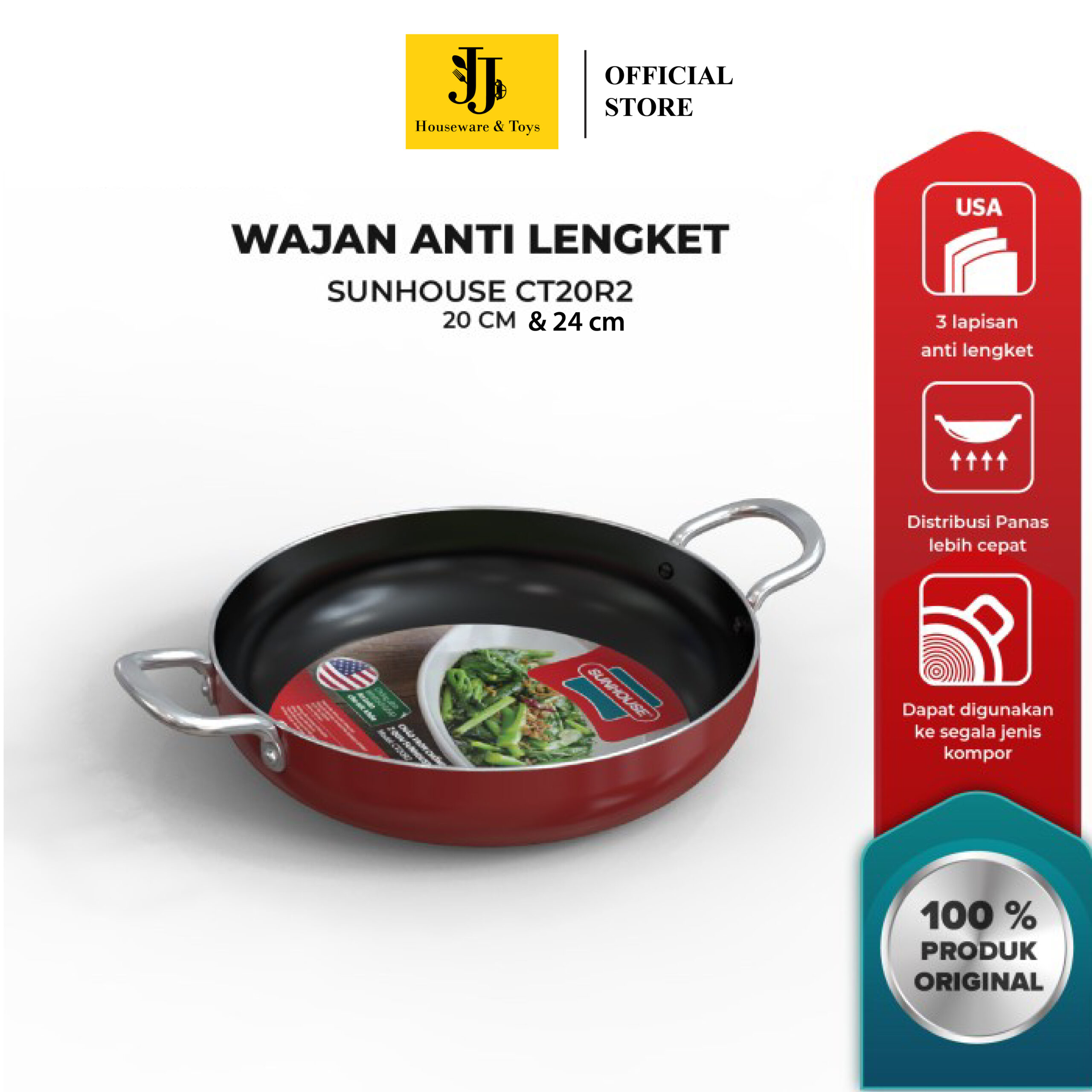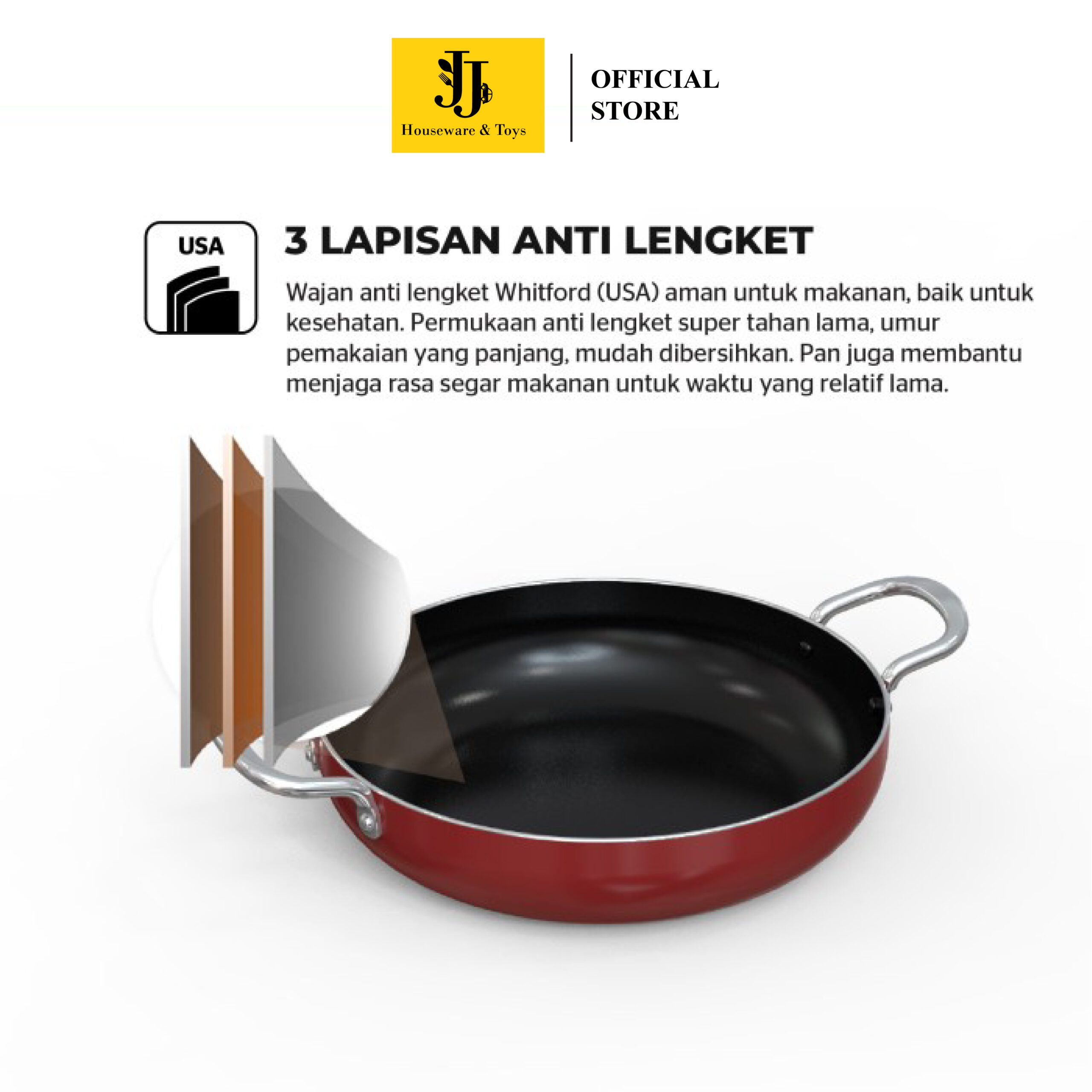 2. Dilapisi oleh 3 lapisan wajan anti lengket dari Whitford (USA) aman untuk kesehatan.